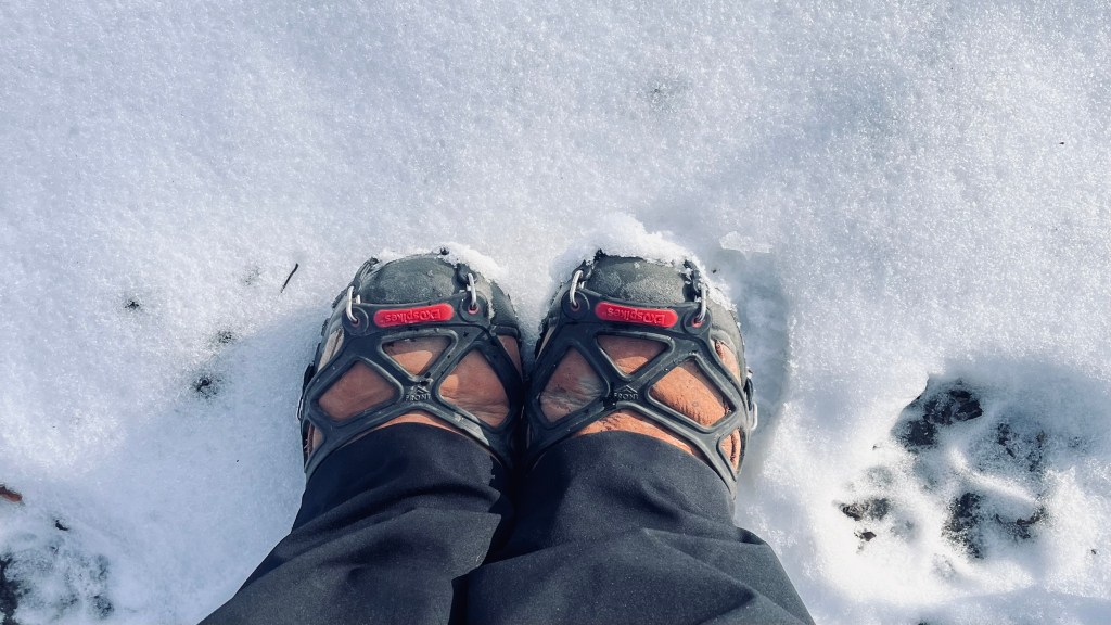 Footwear is a tough one to recommend because everyone’s foot is different. Some people love hiking boots all year round, others love trail runners. Some have different shoes for wet or cold weather vs cold weather. For winter hiking, the most important thing is that your feet are warm and dry, and you have traction in mud, snow, or ice.